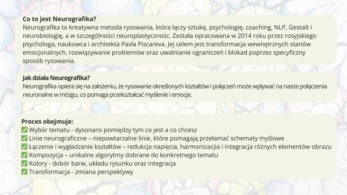 Patrycja prowadzi przez cały proces, oferując silne i kompetentne wsparcie na każdym etapie. Neurographika to cudowna technika, która nie tylko pomaga się odstresować poprzez rysowanie, ale również umożliwia głębszą pracę wewnętrzną.